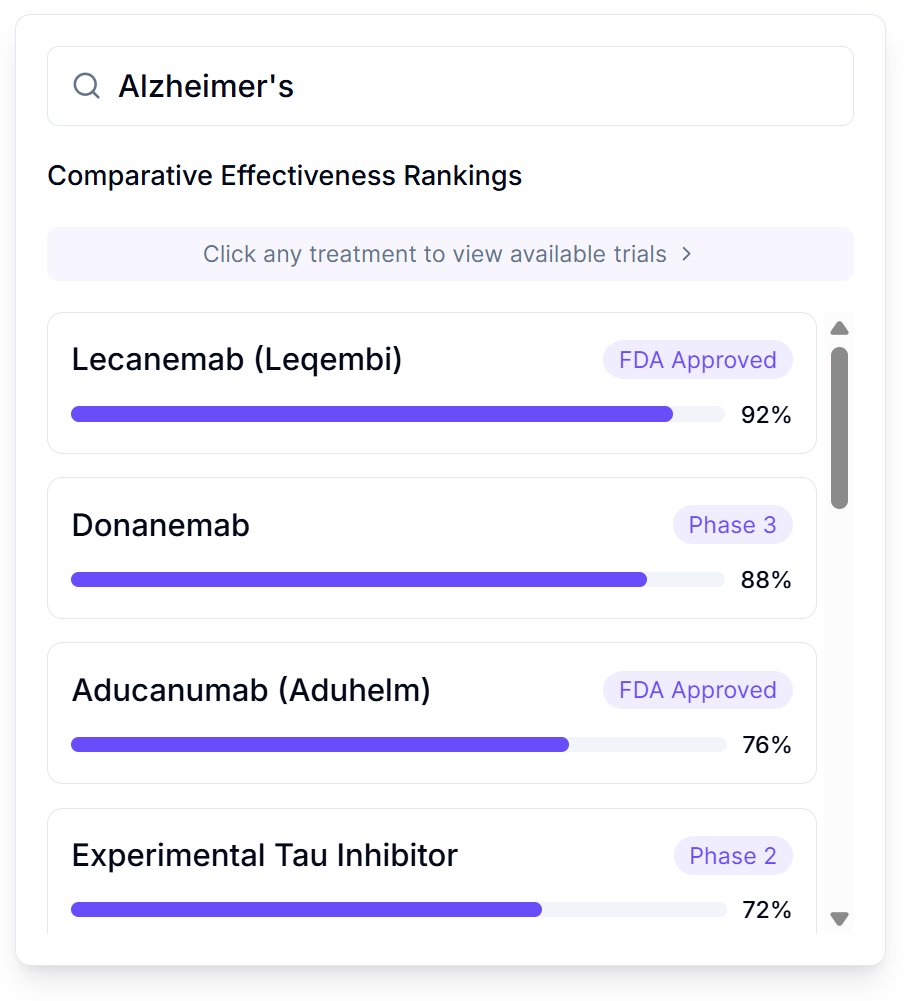 - Treatment Rankings: Every option (FDA-approved drugs, supplements, lifestyle interventions, experimental treatments) ranked by effect size from real patient data