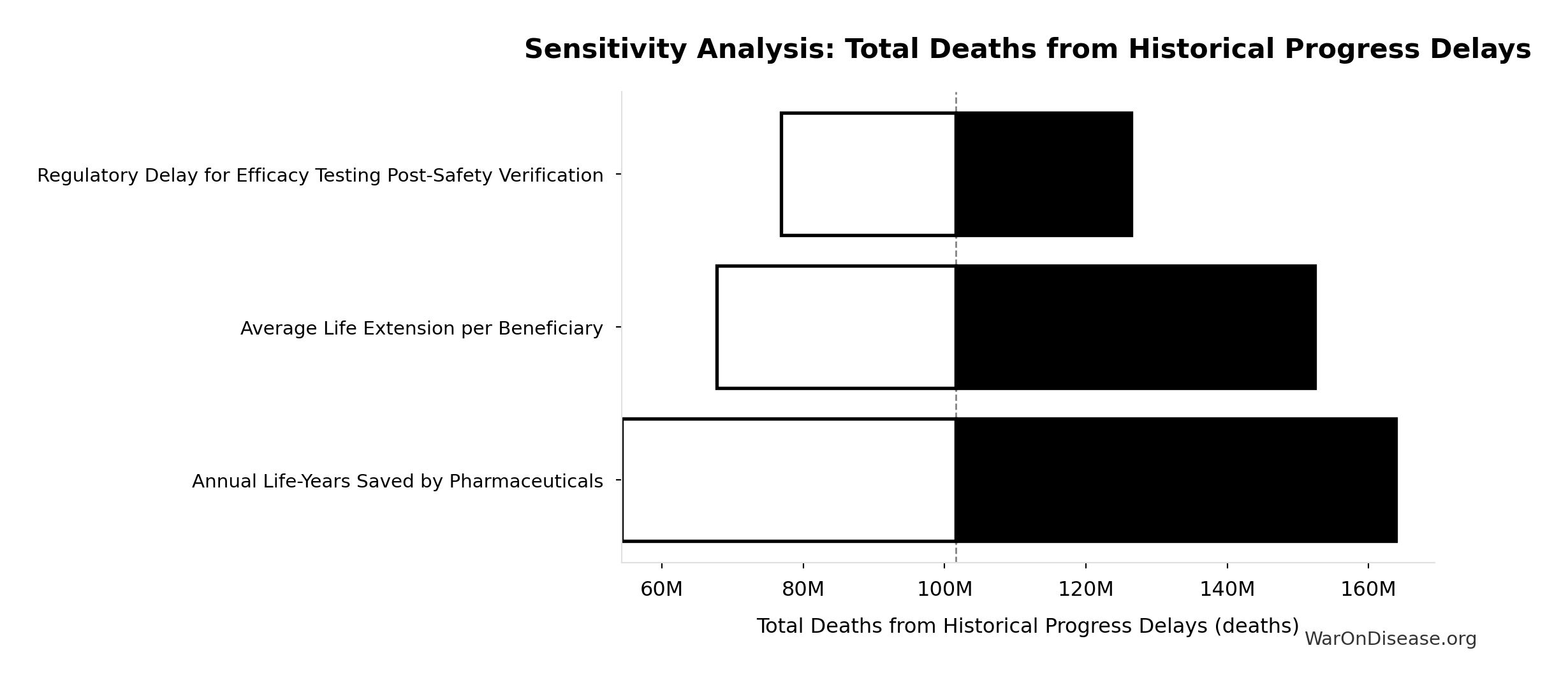 Total deaths from delaying existing drugs over 8.2-year efficacy lag. One-time impact of eliminating Phase 2-4 testing delay for drugs already approved 1962-2024. Based on Lichtenberg (2019) estimate of 12M lives saved annually × 8.2 years efficacy lag. Excludes innovation acceleration effects.